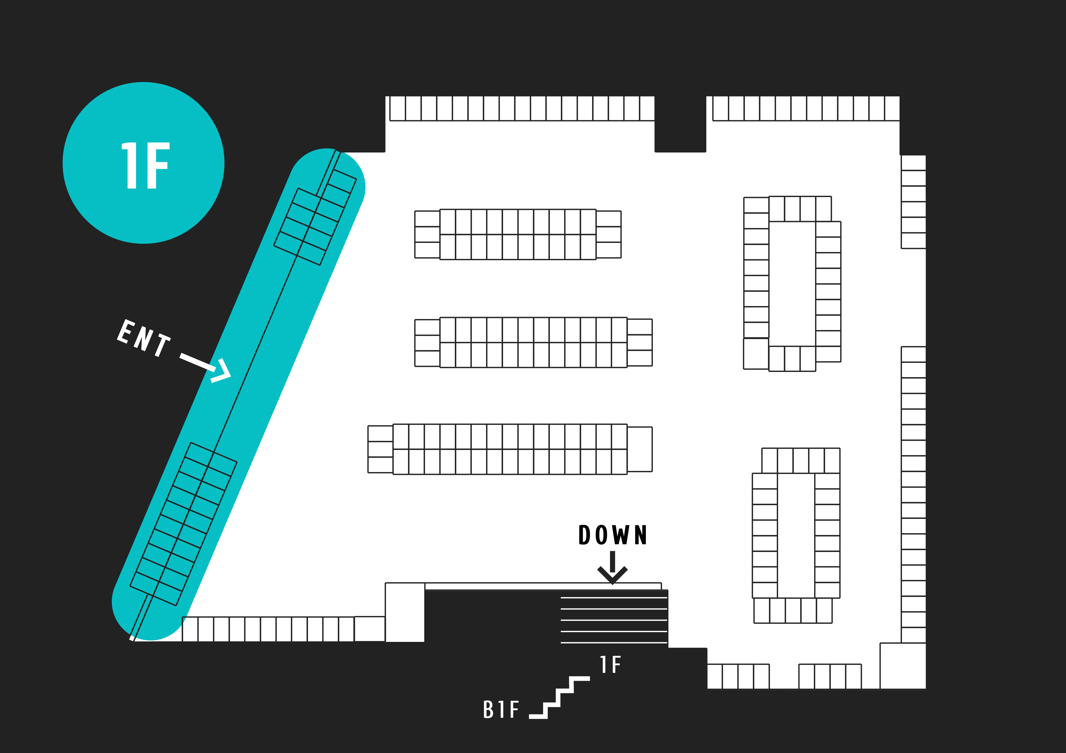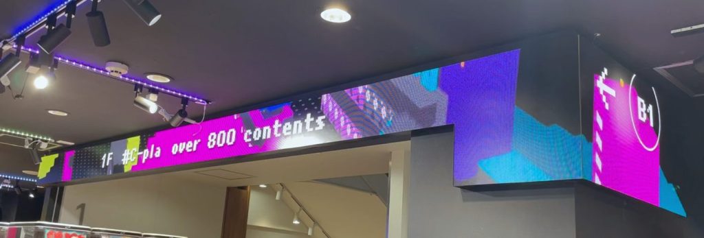 サイネージは通常決まった形のものを設置することが多いと思いますが、#C-plaでは設置する店舗に合わせてとっても横長な画面にしたり、壁の中に埋め込まれていたりと、映像と空間を一体で楽しめます。